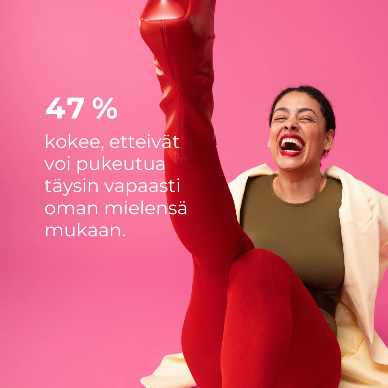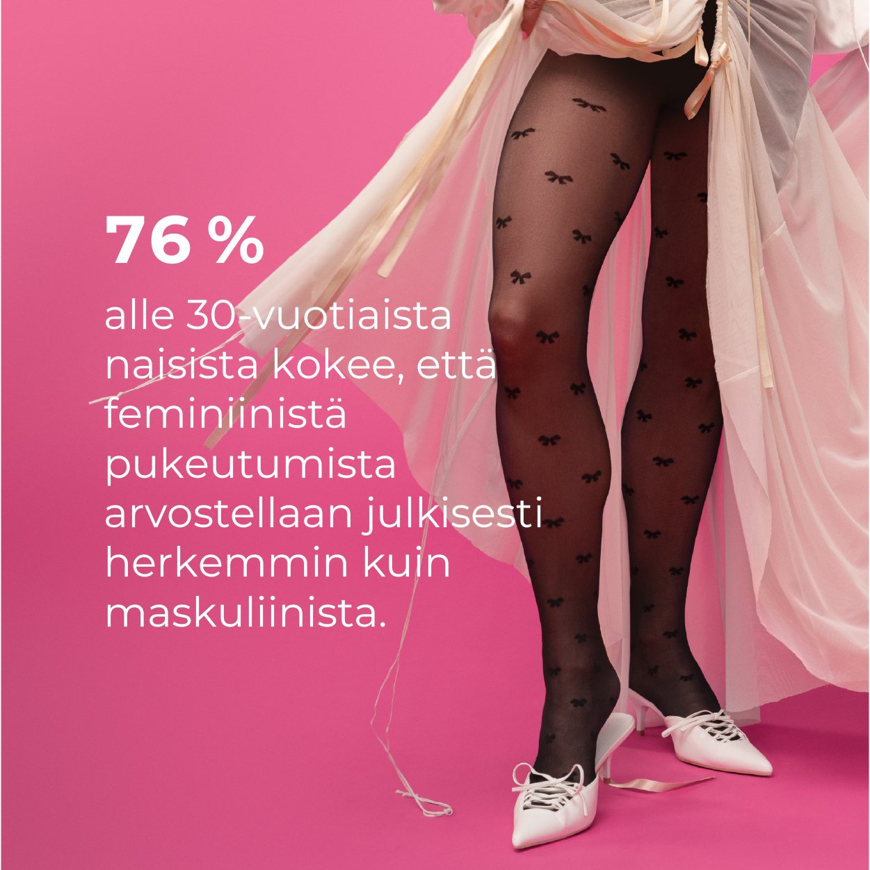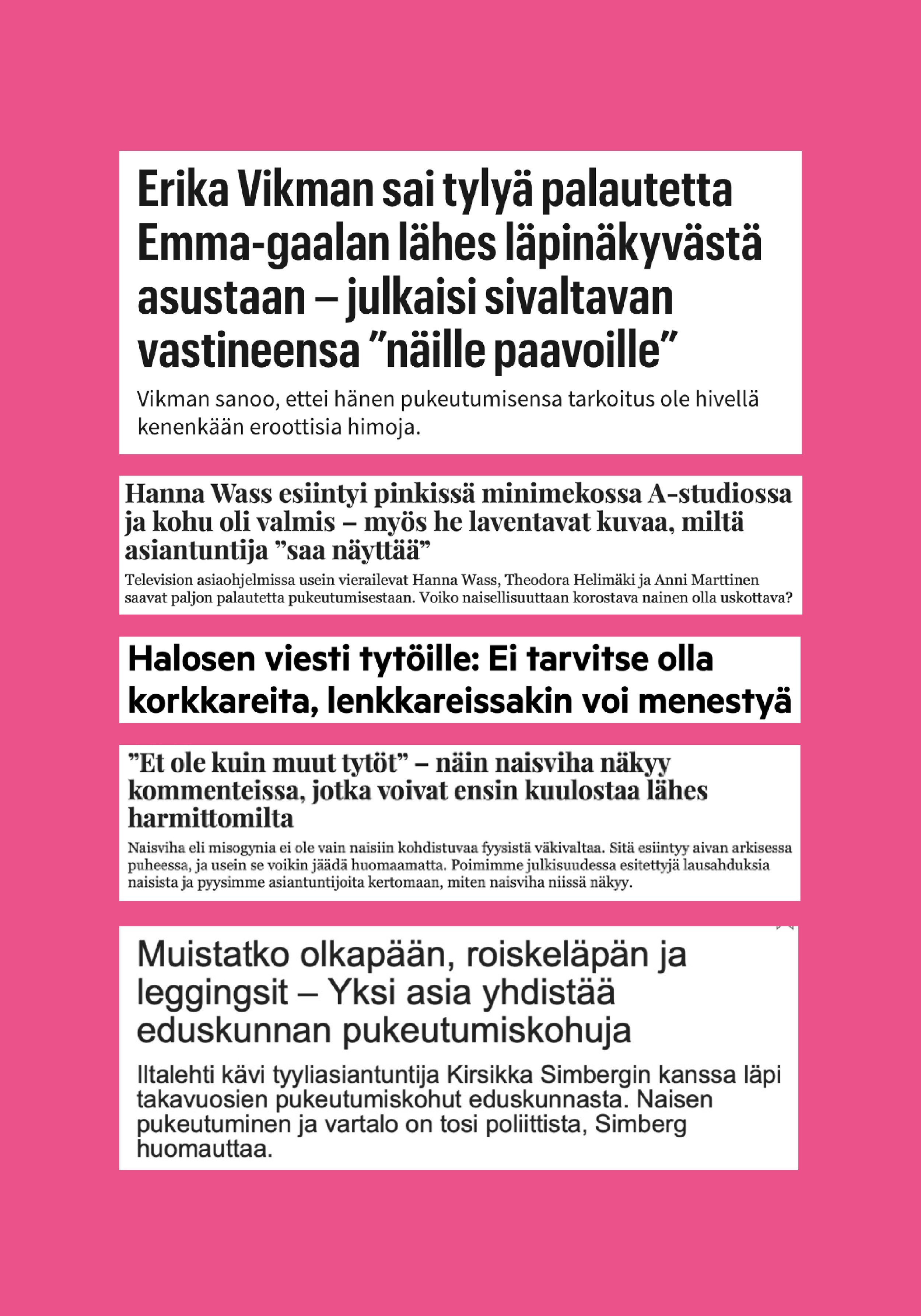 “Mä rakastan vaatteita ja pukeutumista, enkä jaksais sekuntiakaan miettiä, mitä viestin omalla pukeutumisellani. Kun käytän vaaleanpunaista tai tyttömäisiä vaatteita, tuntuu entistä vaikeammalta saada ääni kuuluviin työtapaamisessa. Kun mulla on löysät vaatteet ja lippis mulle ei pidetä ovea auki kauppakeskuksessa. Kun puen paljastavasti alan pelätä miehiä. Nää ajatukset vilisee mielessä, kun pohdin aamuisin mitä laitan päälleni.”