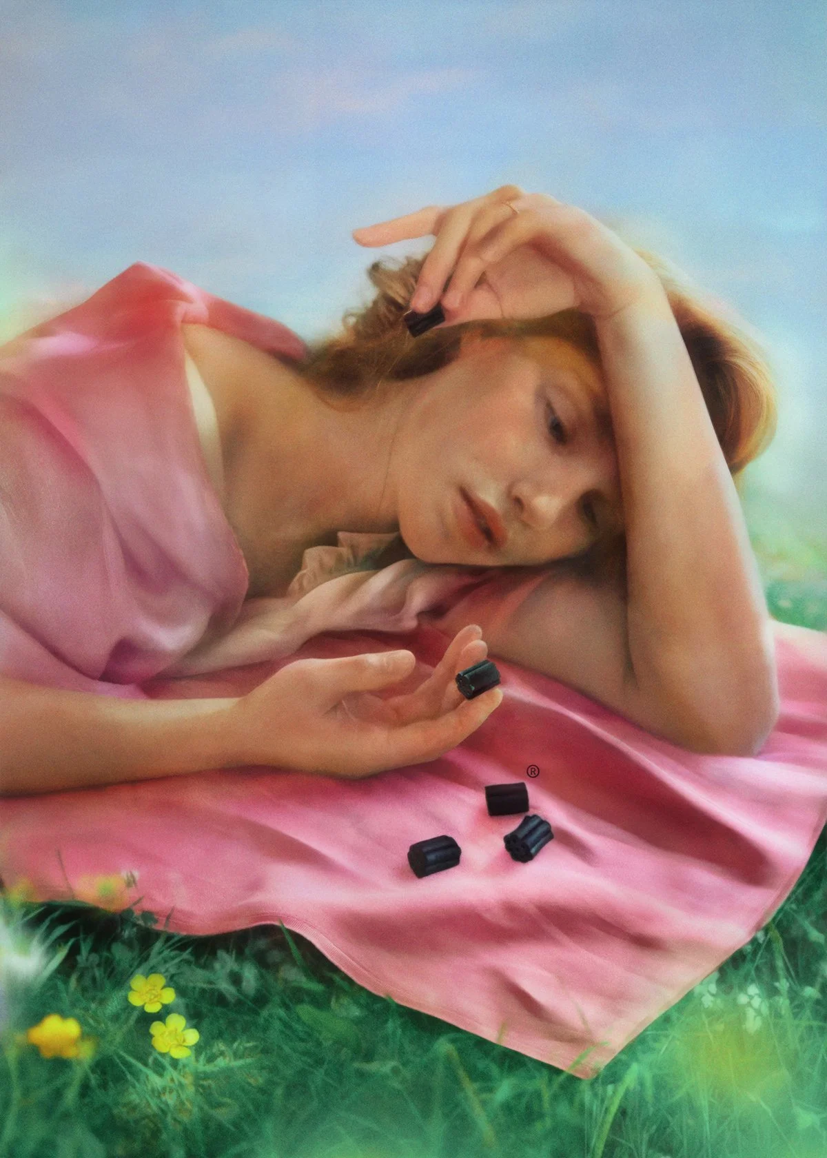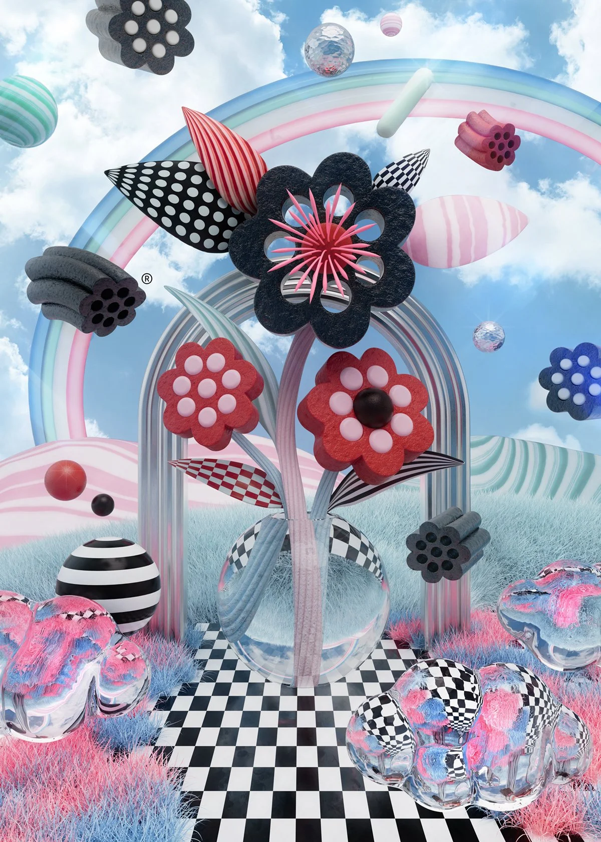 “Inspiroiduin Lakukasta – sen kukkamaisesta muodosta ja vahvasta visuaalisuudesta. Halusin tutkia, miltä lakritsi näyttäisi omana maailmanaan, ja siitä syntyi ajatus surrealistisesta maisemasta, jossa lakritsikukat kasvavat suurina ja makeiset leijuvat ilmassa.