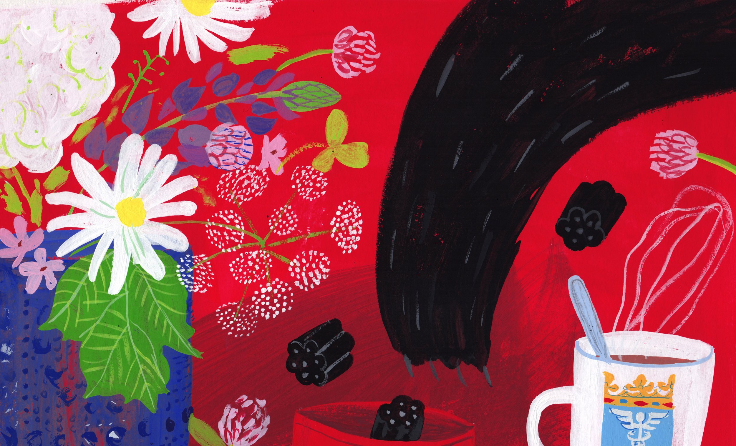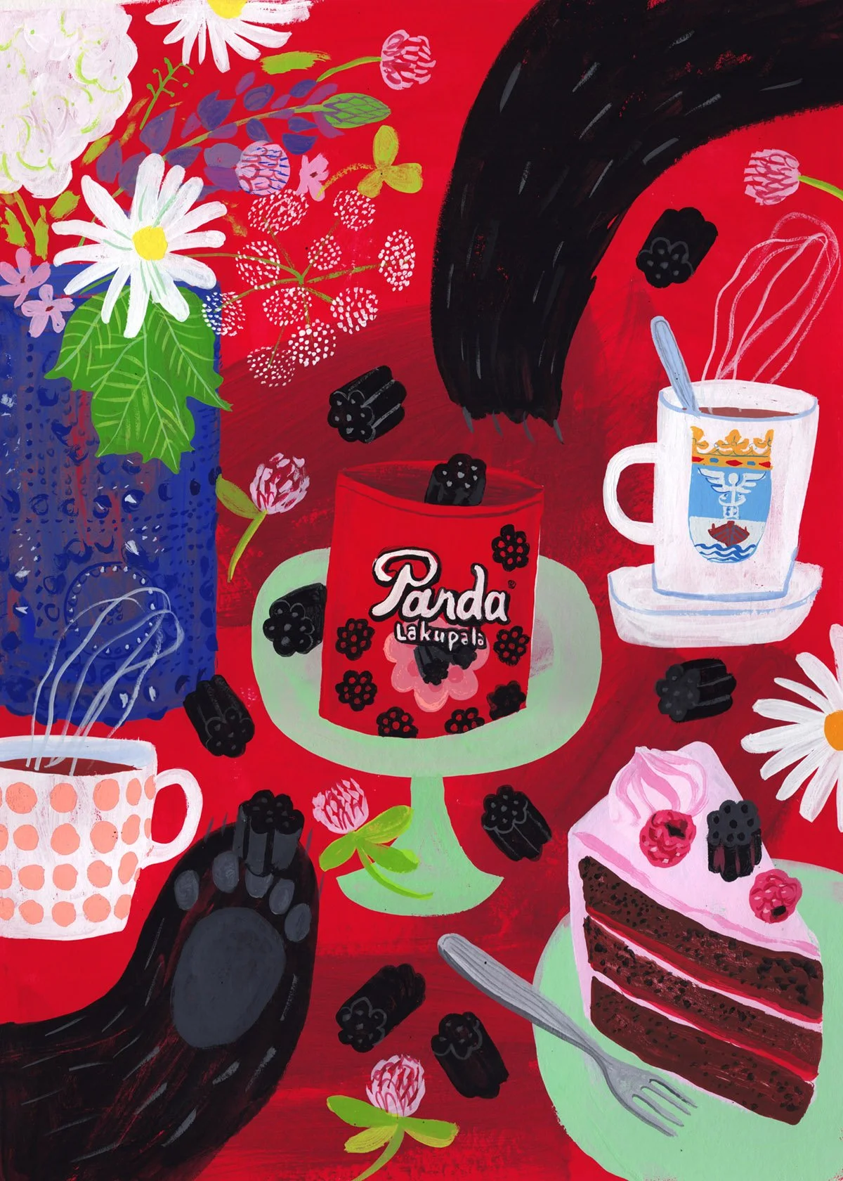“Työskentelyni alkaa aina luonnoskirjasta ja pienistä tulitikkuaskin kokoisista luonnoksista. Fiilistelin ja loin mielikuvia. Toiveissa oli aiemman sarjani mukainen kuvitus, joissa olen maalannut suomalaisia kotileivonnaisia ja vanhoja astioita. Keksin idean pandojen kutsuista joissa tassut kahmivat lakuja ja pöydässä nauttivat vadelmalakritsi-kakkukahveista.