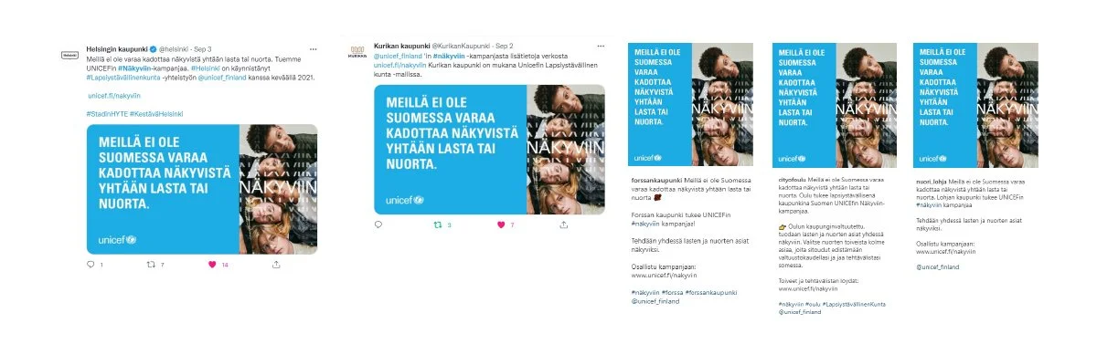 Saadaksemme nuoret #Näkyviin, tuli meidän ensin kadottaa heidät. Päivää ennen kampanjan lanseerausta, nuoria ”katosi”, eli hiipui näkyvistä somejulkkisten tileillä ja ulkomainonnassa. Lanseerauspäivänä katoaminen paljastui kampanjaksi haastaa vastavalittuja kunnan- ja kaupunginvaltuutettuja tuomaan lasten ja nuorten asia esiin valtuustokaudellaan. Lanseerauspäivän mainonnassa hyödynnettiin suoria viestejä nuorilta päättäjille. Viestit saatiin suorina lainauksina nuorille teettämästämme kyselystä.