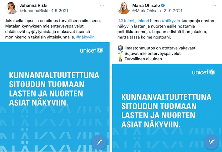 Kuntatasolla pystytään vaikuttamaan moniin lapsia ja nuoria koskeviin kysymyksiin. Vastavalittujen kuntapäättäjien valtuustokausi oli käynnistymässä syyskuun alussa, ja näimme tämän parhaaksi mahdolliseksi hetkeksi vaikuttaa heidän valtuustokautensa agendaan ja tuoda näin UNICEFin Suomen kunnissa tekemää työtä esiin.